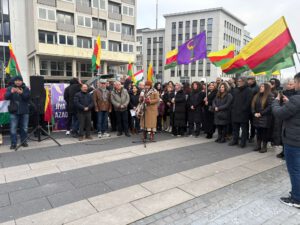 Köln, 18.01.2026. Mîtînga TEV-ÇAND û HUNERA MIZGÎN. Di wêneyê de Hekîm Sefkan, Hozan Şemdîn, Cewad Merwanî, Bermal Çem, Şehrîbana Kurdî, Sosin, Narînxan, Binevş Roj, Diyar û Beser Şahîn cih digire.